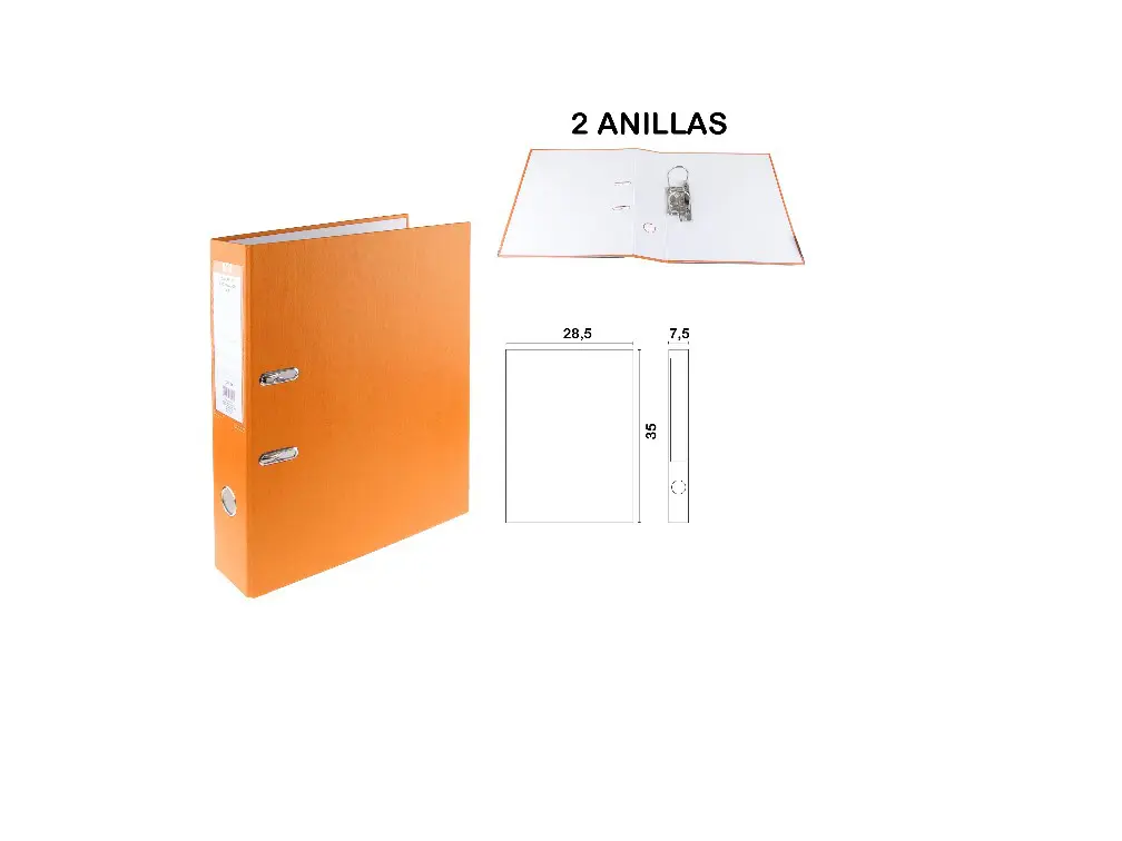 Carpeta de 2 anillas fabricadas en cartón forrado. Lomo de 75 mm, anillas de 40 mm. Orificio para acceso fácil a la carpeta. Con lomera y etiqueta para identificación de los documentos. Para documentos A4. Medidas de la carpeta: 285 × 350 mm. Color naranja.