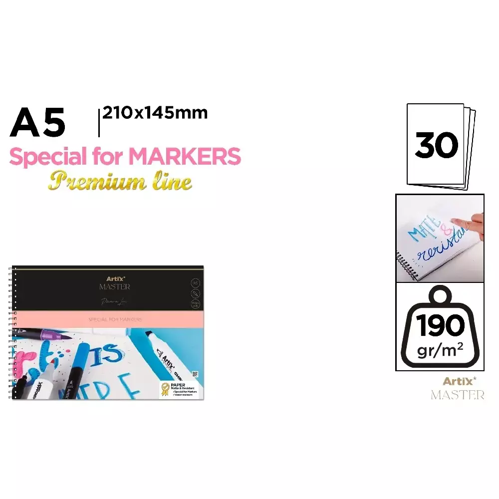 Block de dibujo para pintar especialmente con rotuladores. Papel grueso de 190 g/m² con gran resistencia al agua. Libre de ácidos y gran blancura que permite obtener un excelente contraste y colores armoniosos. 30 hojas. Tamaño A5. Medidas: 210 x 145 mm.