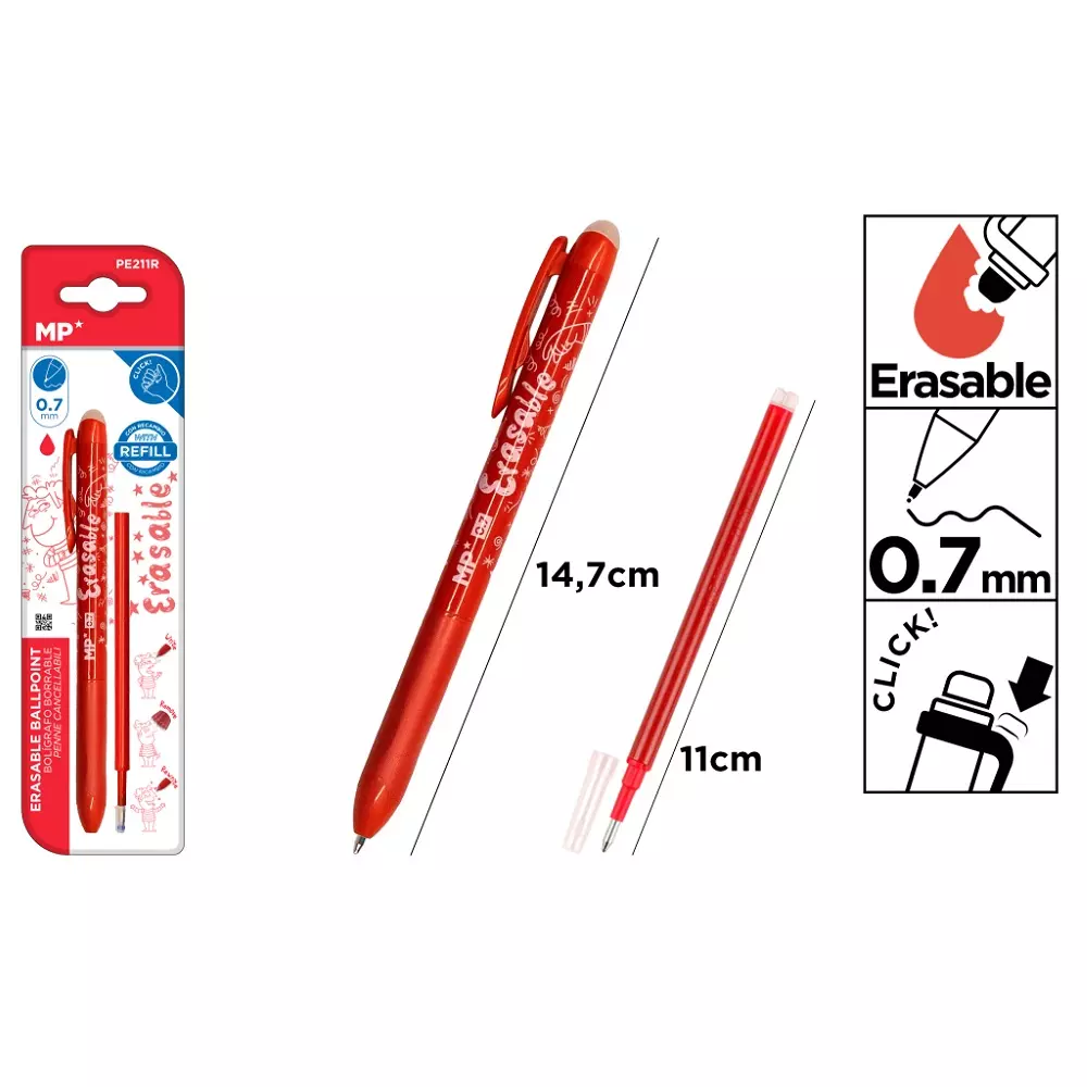 Bolígrafo con borrador y punta retráctil de tinta líquida de color rojo. Punta fina de 0.7 mm. Sistema de clic. Tinta borrable que permite hacer desaparecer cualquier trazo. Escribe, borra y reescribe sin ningún problema. Durable y resistente.