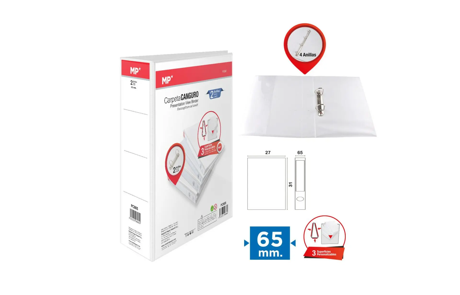 Carpeta canguro de anillas fabricada en plástico. Funda en portada y lomo para personalizar, perfecta para presentar proyectos. Para documentos A4. Medidas de la carpeta: 310 x 270 mm. 2 anillas de 65mm. Color blanco.