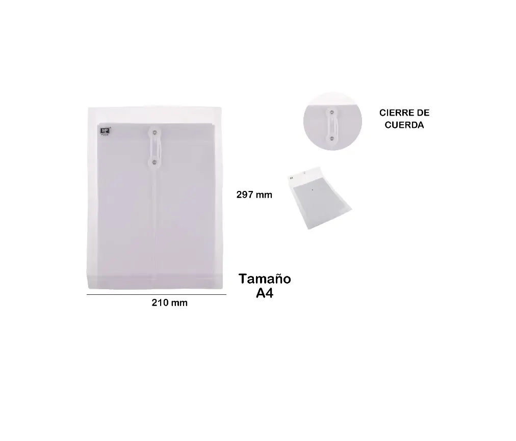 Carpeta sobre fabricada en polipropileno translúcido con cierre de cuerda. Formato vertical. Para documentos A4. Medidas: 310 x 235 mm. Color transparente blanco.
