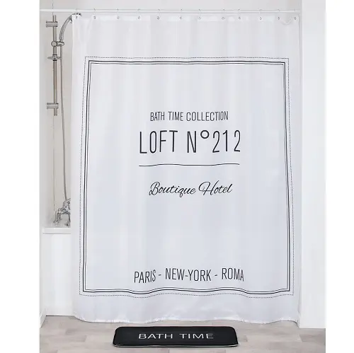 Cortina de ducha con diseño moderno en color blanco con detalles en negro. Hecho de 100% poliéster. Compatible tanto con ducha como con bañera. No viene incluido con anillos para colgar a la ducha. Medidas 180 x 200 cm.