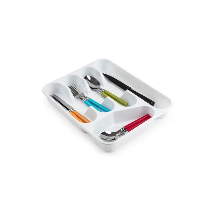 Bandeja básica para cubiertos de color blanco. Con cinco compartimientos de diferentes tamaños. Ideal para guardar en cajones y muebles de cocina. Organiza con claridad los cubiertos y aporta una mayor comodidad.