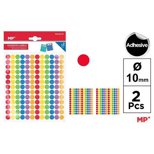 Etiquetas adhesivas redondas de colores de 10,5 mm de O. Son perfectas para que los más pequeños aprendan de una manera didáctica y creativa o para decorar dibujos y manualidades. Venta individual. 2 hojas con 156 etiquetas cada una en 6 colores surtidos: rojo, amarillo, naranja, verde, azul y morado. 312 etiquetas.