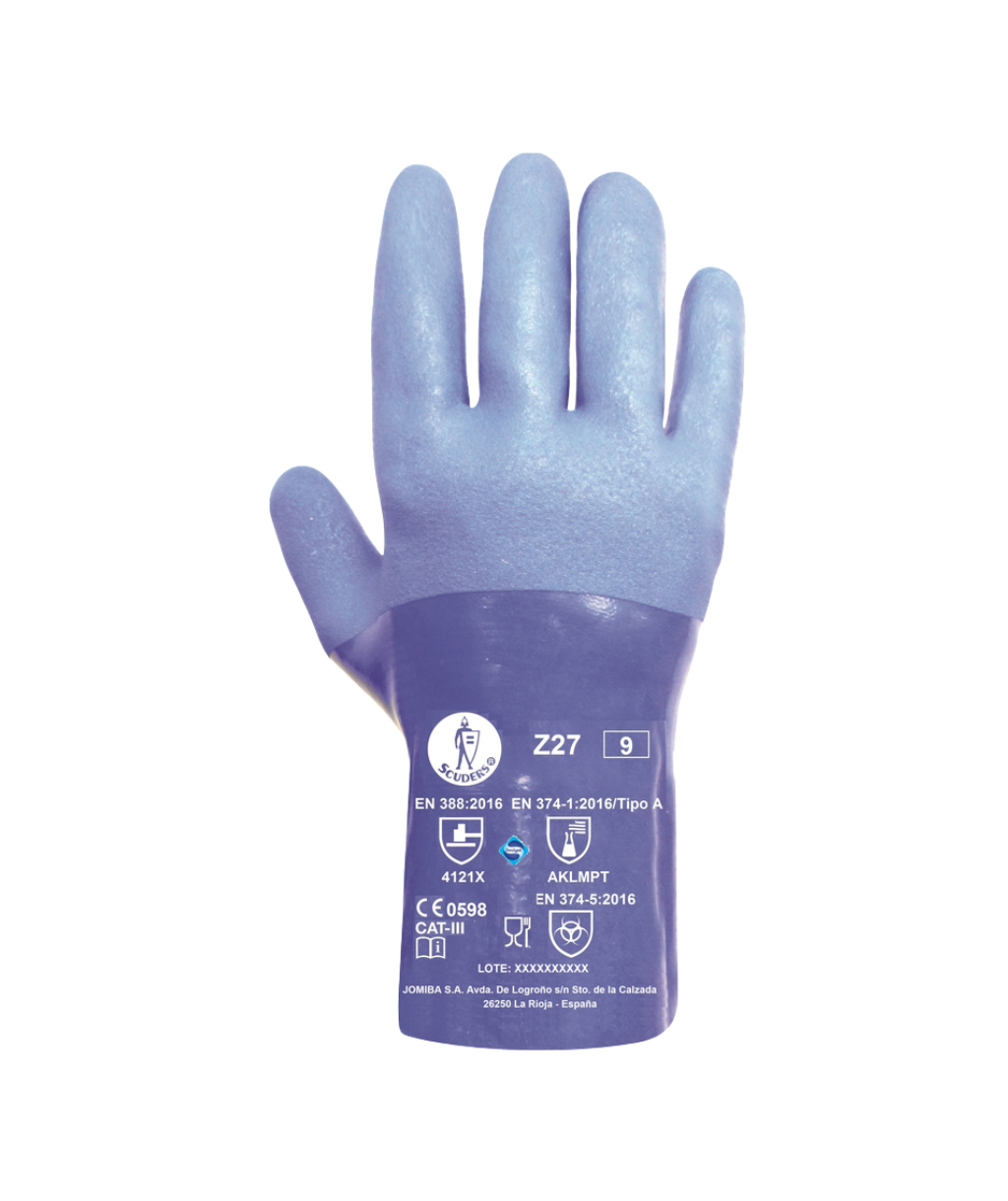 Guantes de protección contra riesgos químicos, hongos y bacterias y contra riesgos mecánicos, sin costuras y totalmente recubiertos de PVC de triple capa con soporte de algodón. Longitud de 27 cm, superficie rugosa en palma y dorso proporcionando un buen agarre.