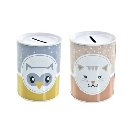 Hucha redonda de material metal, con dibujo animal. Disponible 2 modelos surtidos, venta individual al azar.