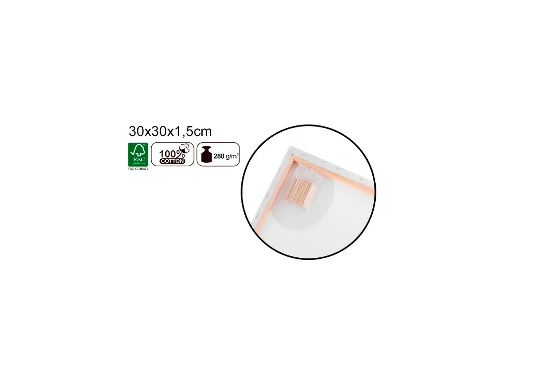 Lienzo profesional de alta calidad en 280 g/m2 fabricado en tela de algodón 100% tratado con tres capas de imprimación blanca que hace que el pincel se deslice muy fácilmente y el acabado sea profesional. Tela perfectamente tensada y grapada al bastidor de madera de 1,5 cm de grosor. Indicado para pintura al óleo y acrílica. Medidas: 30 x 30 cm.