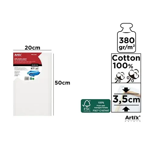 Lienzo profesional de alta calidad en 380 g/m2 fabricado en tela de algodón 100% tratado con tres capas de imprimación blanca que hace que el pincel se deslice muy fácilmente y el acabado sea profesional. Tela perfectamente tensada y grapada al bastidor de madera de 3,5 cm de grosor. Incluye un juego de cunas de madera para las esquinas y tensar homogeneamente y abrir más la tela. Indicado para pintura al óleo y acrílica. Medidas: 20 x 50 cm.