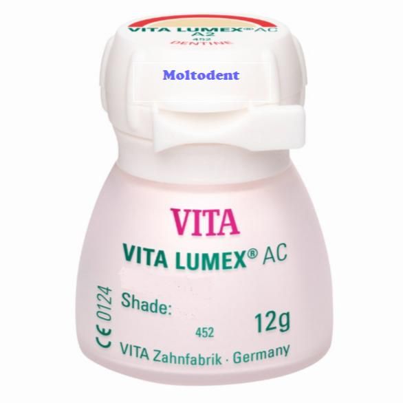 Vita Lumex AC es un sistema de recubrimiento de cerámica vítrea reforzada con Leucita. Está indicada para el recubrimiento de todos los materiales de estructuras de cerámica sin metal de uso habitual, como dióxido de circonio, disilicato de litio y feldespato, así como la confección de reconstrucciones sin estructura, como p.ej. carillas.