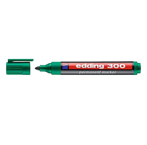 Marcador permanente edding 300 de color verde de trazo de la punta redonda. Tiene una punta de 1,5 a 3 mm de grosor. Marcador permanente para marcar y etiquetar sobre casi todos los materiales. Resistencia al agua y al roce sobre casi todas las superficies. Fabricado en Alemania.
