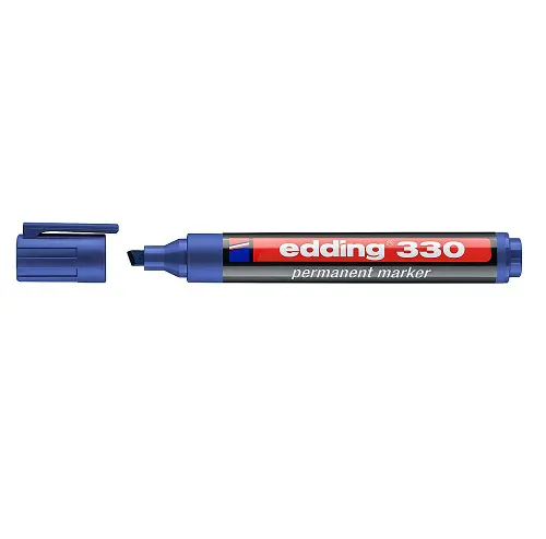 Marcador permanente edding 330 de color azul de trazo de la punta biselada. Tiene una punta de 1 a 5 mm de grosor. Marcador permanente para marcar y etiquetar sobre casi todos los materiales. Resistencia al agua y al roce sobre casi todas las superficies. Fabricado en Alemania.