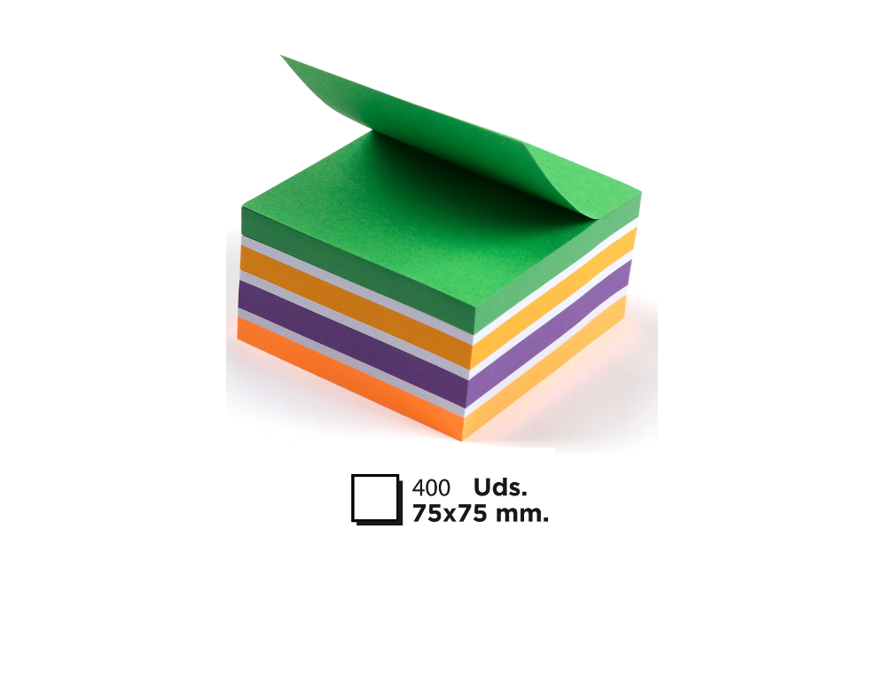 Taco de 400 notas adhesivas de tamaño 75 x 75 mm. En colores surtidos. Se pueden utilizar para dejar recordatorios, crear planificaciones, marcar partes de libros y textos. Útiles para trabajos escolares, de oficina y para tener en casa. No te quedes sin notas cuando más las necesites.