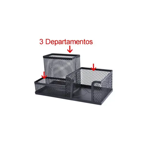 Organizador de sobremesa para tener todos los complementos de oficina a mano y ordenados. Fabricado en metal de rejilla color negro. Muy resistente. 3 huecos para poner lápices, rotuladores, tijeras, grapadoras, notas de quita y pon…