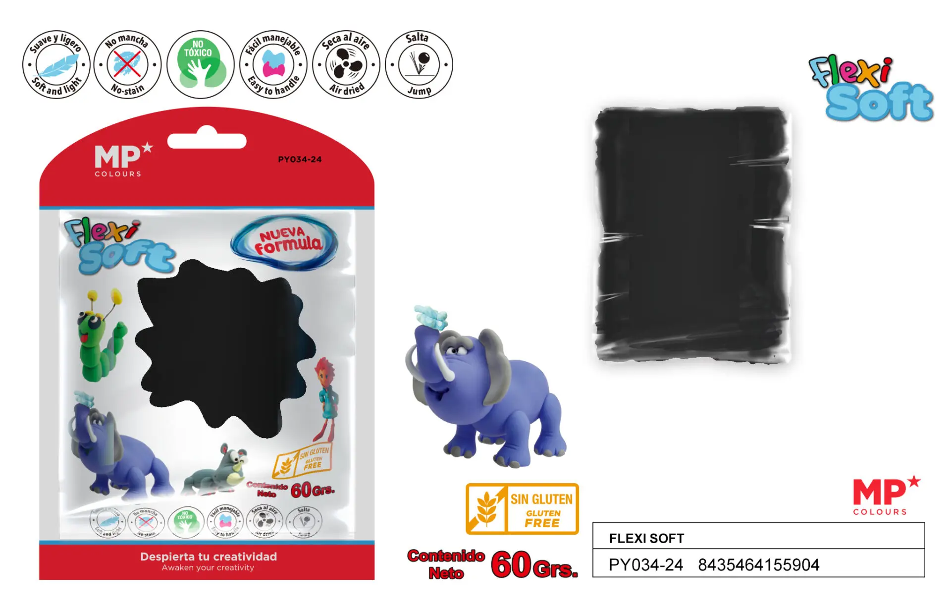 Pack de 60 gramos de pasta para modelar en color negro. Lista para usar. Masa suave y ligera. Sin gluten. No tóxico. No mancha. Súper fácil de manejar. Secado al aire, no es necesario el uso de horno ni de microondas. Una vez seco puede votar y saltar. Especialmente indicado para manualidades, actividades artísticas, talleres, etc.
