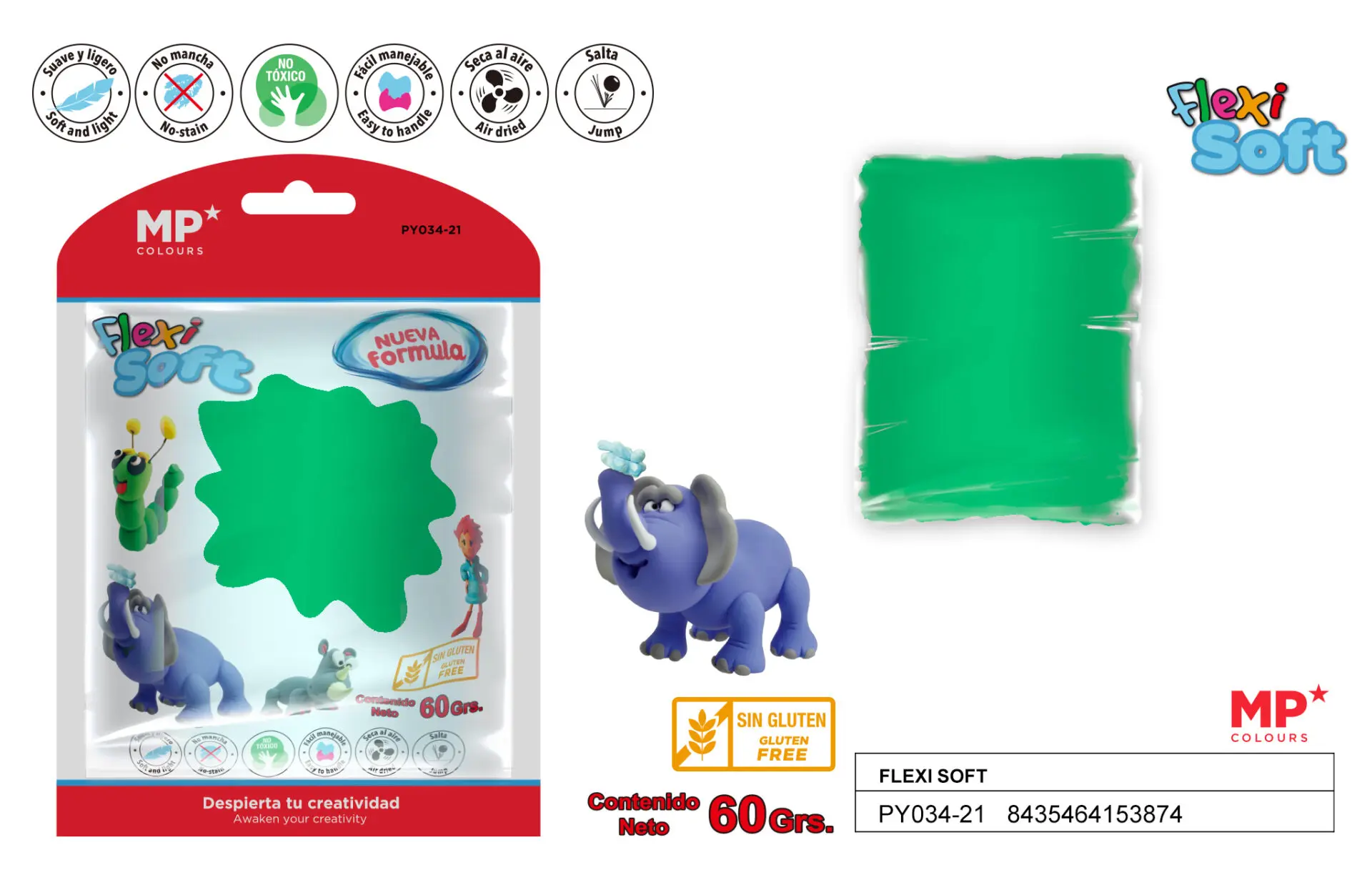 Pack de 60 gramos de pasta para modelar en color verde. Lista para usar. Masa suave y ligera. Sin gluten. No tóxico. No mancha. Súper fácil de manejar. Secado al aire, no es necesario el uso de horno ni de microondas. Una vez seco puede votar y saltar. Especialmente indicado para manualidades, actividades artísticas, talleres, etc.