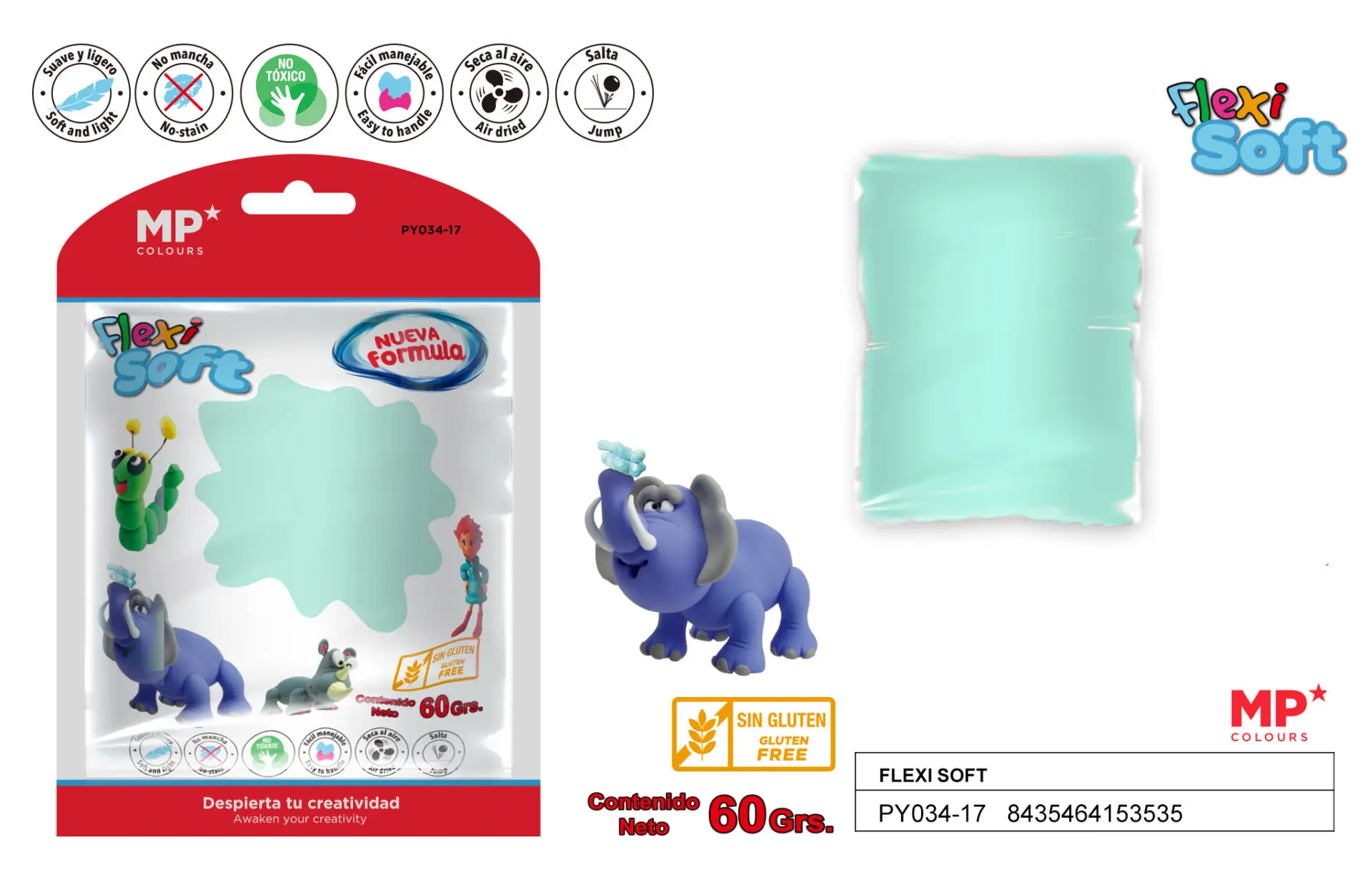 Pack de 60 gramos de pasta para modelar de color verde pálido. Lista para usar. Masa suave y ligera. Sin gluten. No tóxico. No mancha. Súper fácil de manejar. Secado al aire, no es necesario el uso de horno ni de microondas. Una vez seco puede votar y saltar. Especialmente indicado para manualidades, actividades artísticas, talleres, etc.