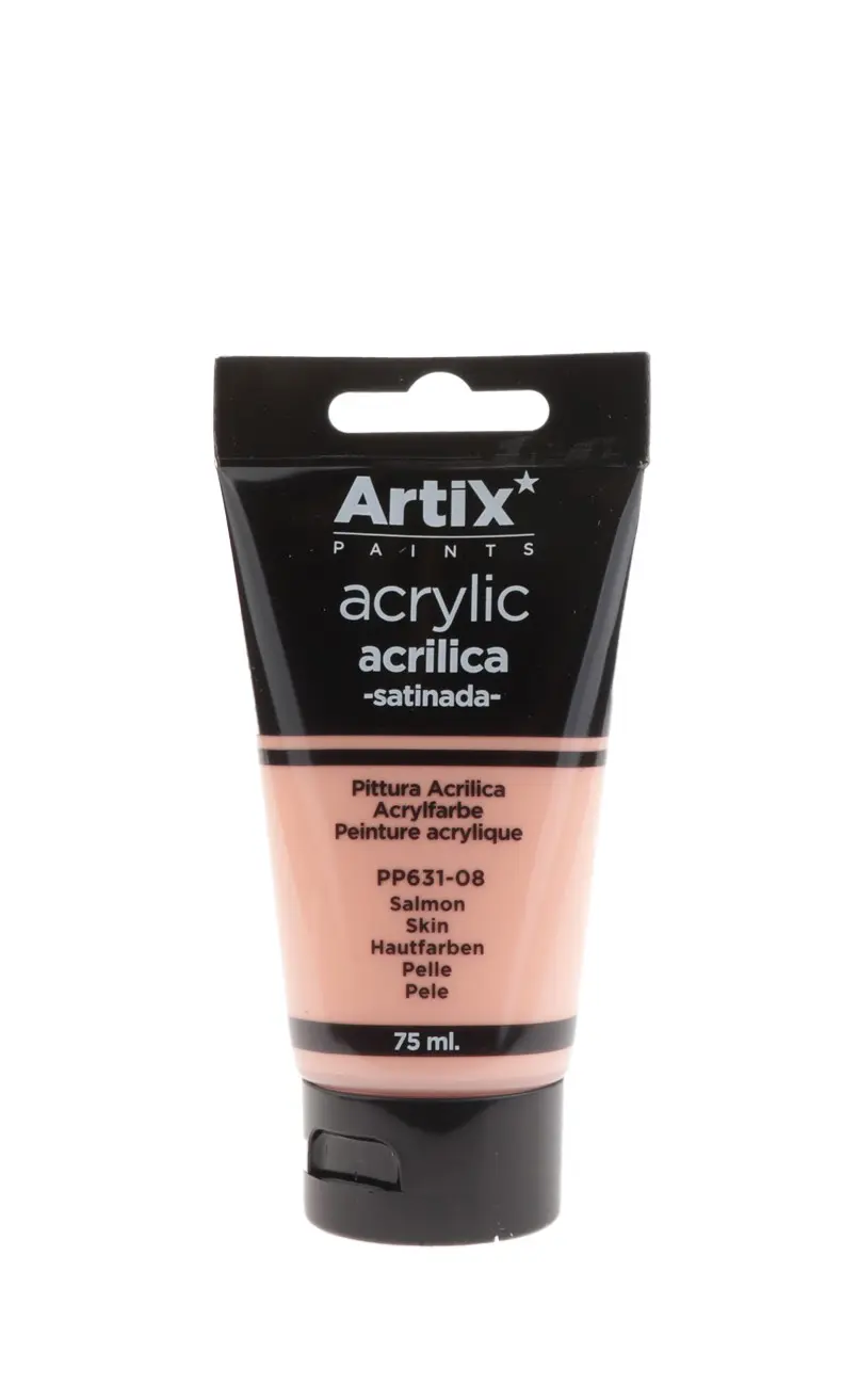 Tubo de 75 ml de pintura acrílica de color carne. Apta para pintar en lienzos, cartón, papel o cualquier otra superficie. Soluble en agua, está hecha con resina sintética mezclada con pigmentos. Al aplicarla se seca rápidamente. No hace falta usar disolventes para diluirla ni para limpiar la paleta o los pinceles, lo que hace que trabajar con ella sea muy fácil.
