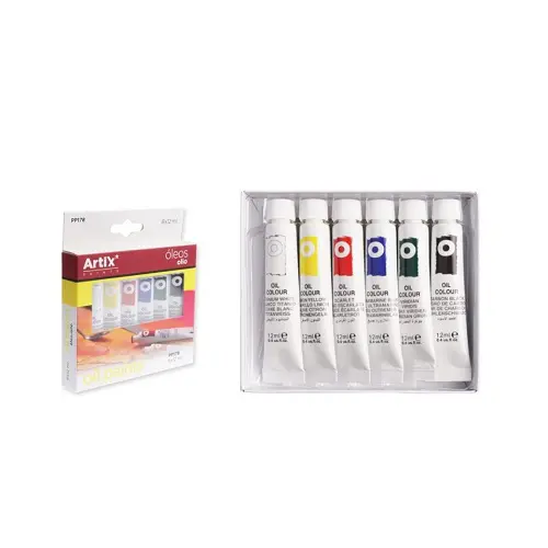 Pintura al óleo con base de aceite. Para técnicas de pintura al óleo y utilizar sobre lienzos. Se pueden mezclar entre sí creando una amplia tonalidad de colores. Estuche de 6 tubos de 12 ml encolores surtidos.