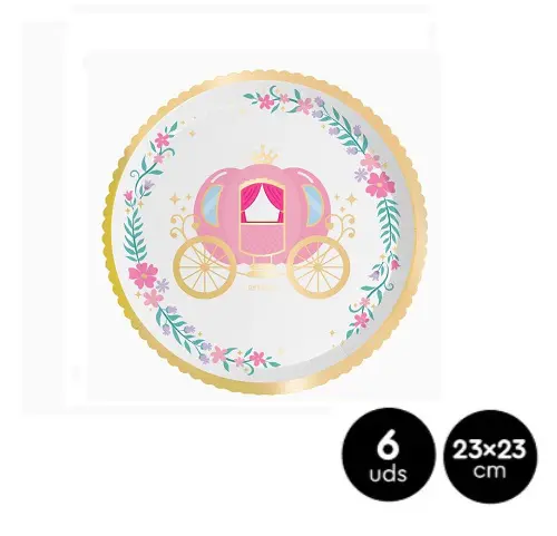 Platos de cartón de princesas con carroza, perfecto para entrantes o como plato individual. Ideal para utilizar en los cumpleaños infantiles, baby showers o fiestas temáticas o llenas de magia. 6 unidades.
